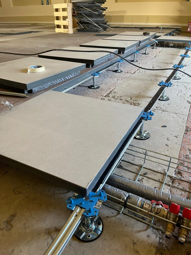 Newfloor è intervenuta con al fornitura e posa di un sistema sopraelevato radiante realizzato con pannelli G30H0F in solfato di calcio sp. 30mm, con lato inferiore nudo primerizzato. La finitura superiore è stata realizzata in grès Saime, serie Materia, finitura naturale, nelle varianti cromatiche Mattone e Calce.